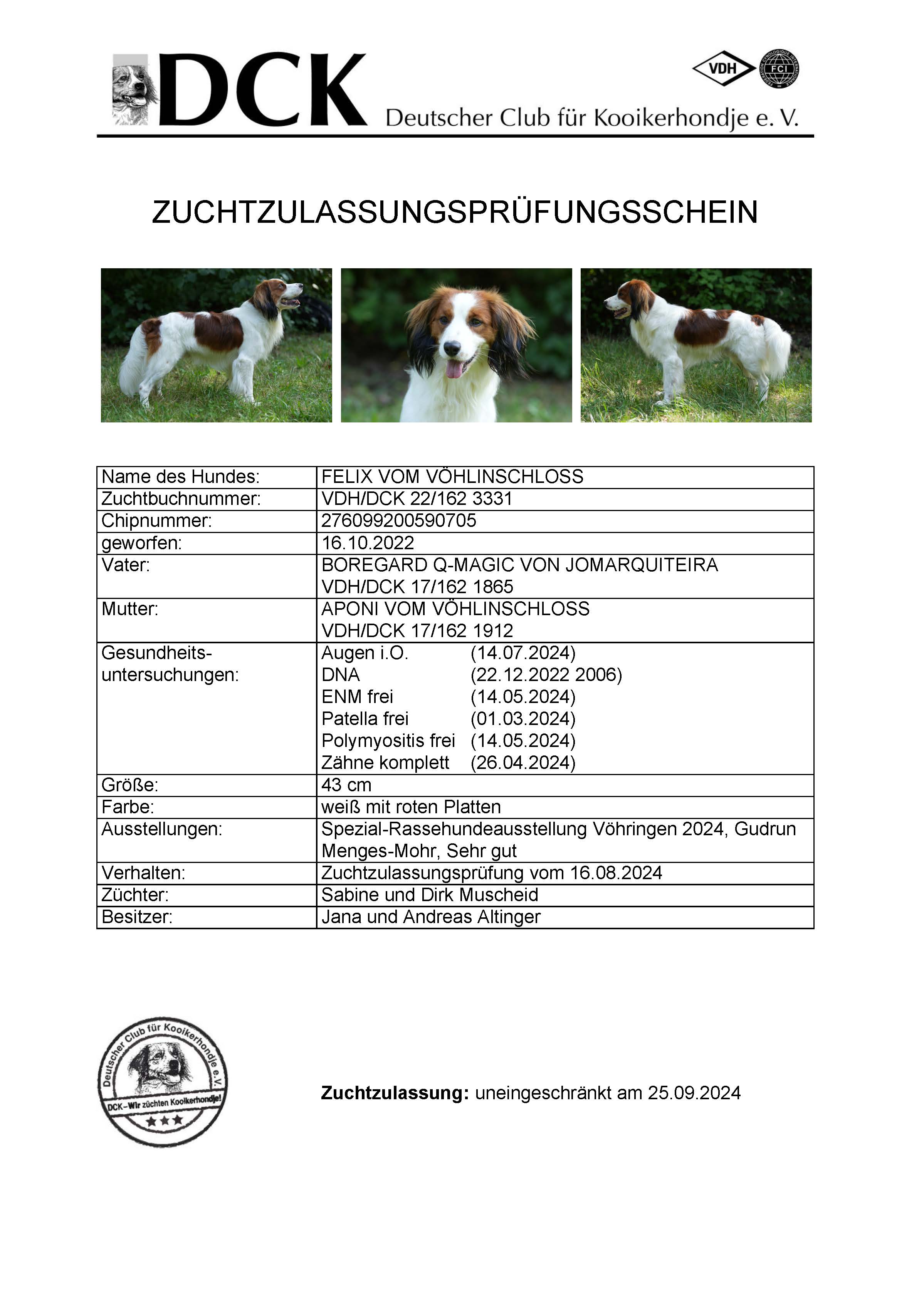 Nun ist Felix zur Zucht im DCK, beim VDH und weltweit in der FCI zugelassen. Herzlichen Glückwunsch! Wir wünschen euch viele gesunde Nachkommen!