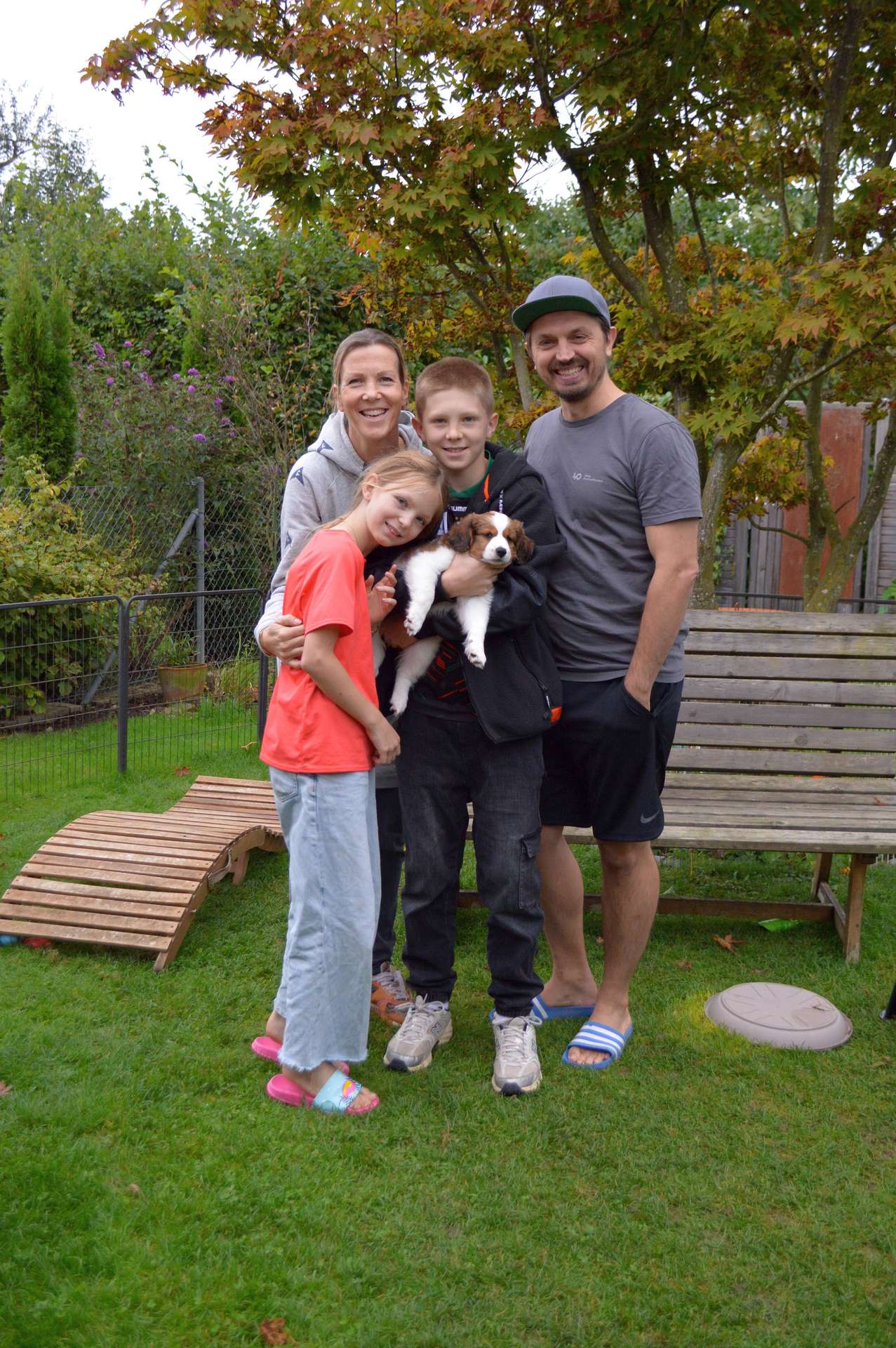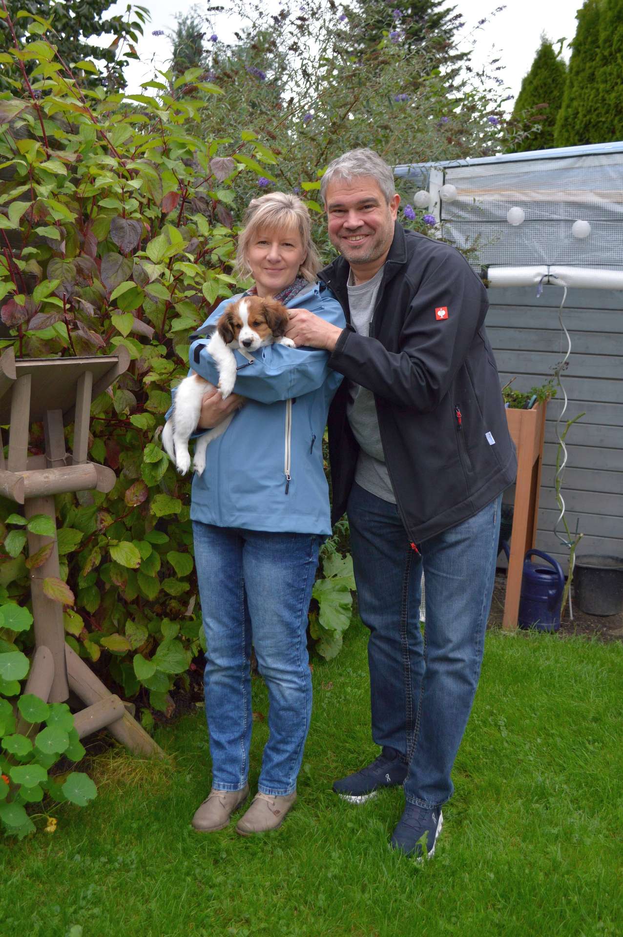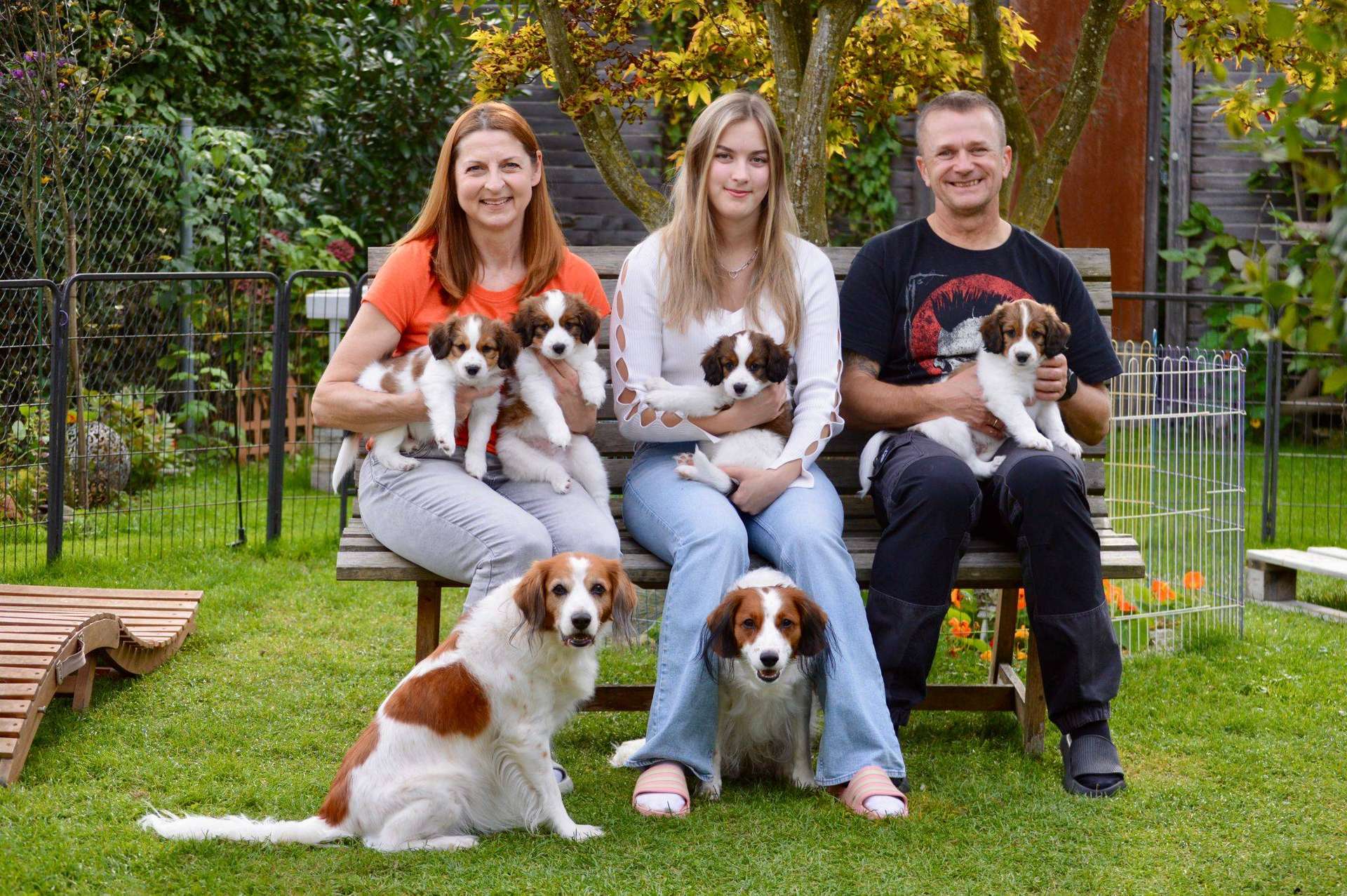 In der 5. Woche waren wir fleißig und haben den Garten sowie die Terrasse welpensicher in ein Outdoorparadies für Kooiker umgebaut. Auch das Gehege im Haus wurde auf die finale Größe erweitert. Der Aktionsradius der vier Welpen wird täglich größer, und es kommt immer etwas Neues hinzu. Inzwischen dürfen sie bei jeder Wachphase nach draußen. Dabei zeigen sie sich schon ganz frech und mutig gegenüber der Oma, die sie dann jedoch auch schnell mal zurechtweist.