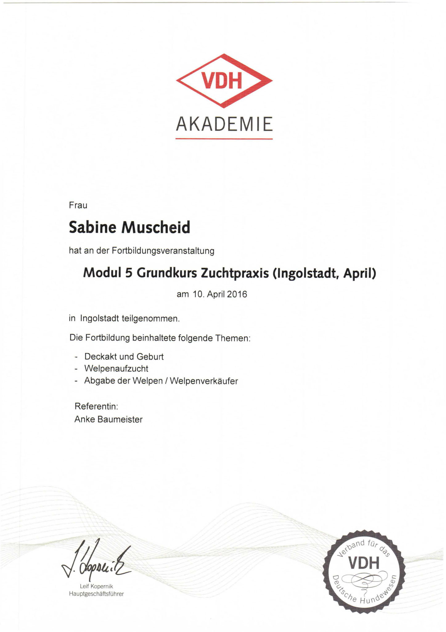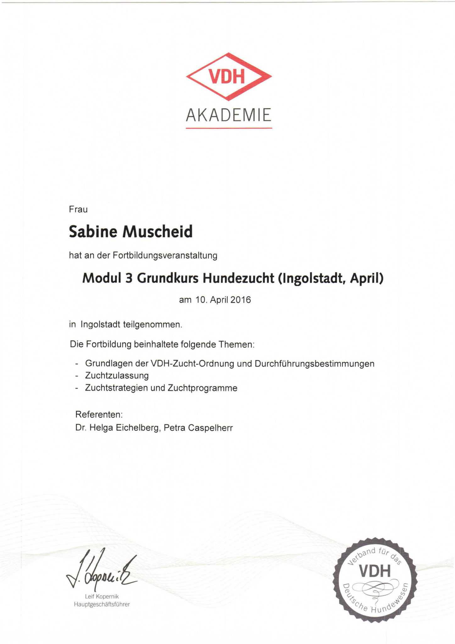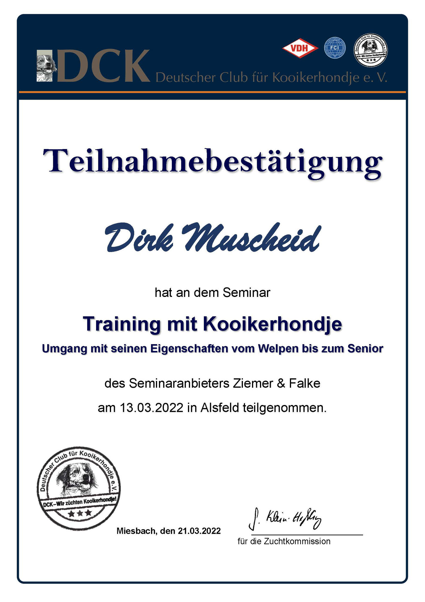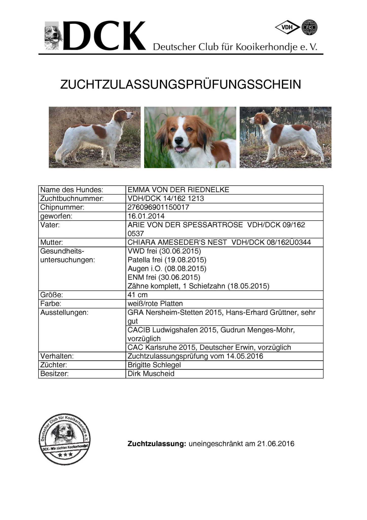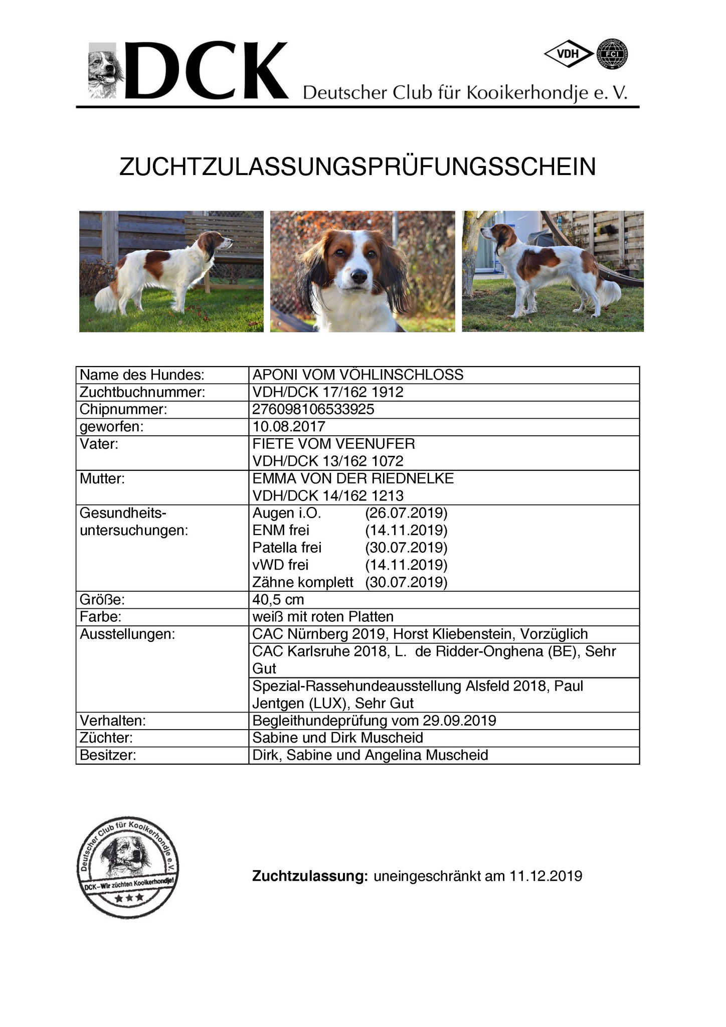 Wir bieten unseren Welpen unendliche Möglichkeiten an, um sich in der Zukunft zu gut sozialisierten Hunden zu entwickeln. Schauen sich sich in Ruhe die Bilder unserer Würfe an! Den neuen Besitzern stehen wir natürlich bei allen Fragen von "A wie Abgabe" bis "Z wie ziehen an der Leine" vor, während und nach der Welpenabgabe zur Verfügung. Wir besitzen mit Emma seit dem 21.06.2016 (sie ist seit Ende 2020 im "Ruhestand") und mit Aponi seit dem 11.12.2019 die Zuchtzulassung des DCK, des VDH und der FCI. Unsere Zuchtstätte wurde international am 28.07.2016 durch den VDH und die FCI annerkannt. Der Weg zu einem gesunden Welpen aus kontrollierter Zucht ist in diesem PDF-Dokument (VDH-Gütesiegel) unseres Dachverbandes VDH sehr schön beschrieben.